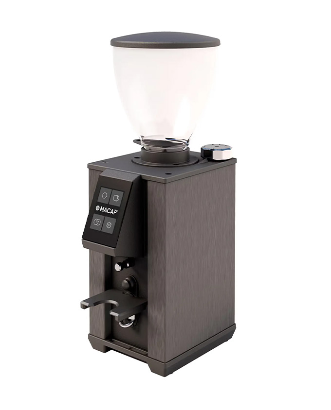 El molino Leo 55 Touch dispone de pantalla táctil de 2,4”, selección de dosis programable desde la pantalla, 2 dosis más función continua, contador de dosis integrado, ajuste micrométrico con perilla de aluminio y botón de inicio IP68.