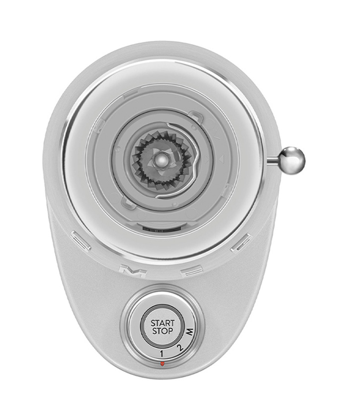 Calidad profesional. El molinillo CGF02 está equipado con una muela cónica de acero inoxidable con muela superior extraíble, un contenedor de granos de café de 240 g en Tritan™ Renew* con tapa sellada, un soporte universal para portafiltro y una placa magnética extraíble, ambos en acero inoxidable.